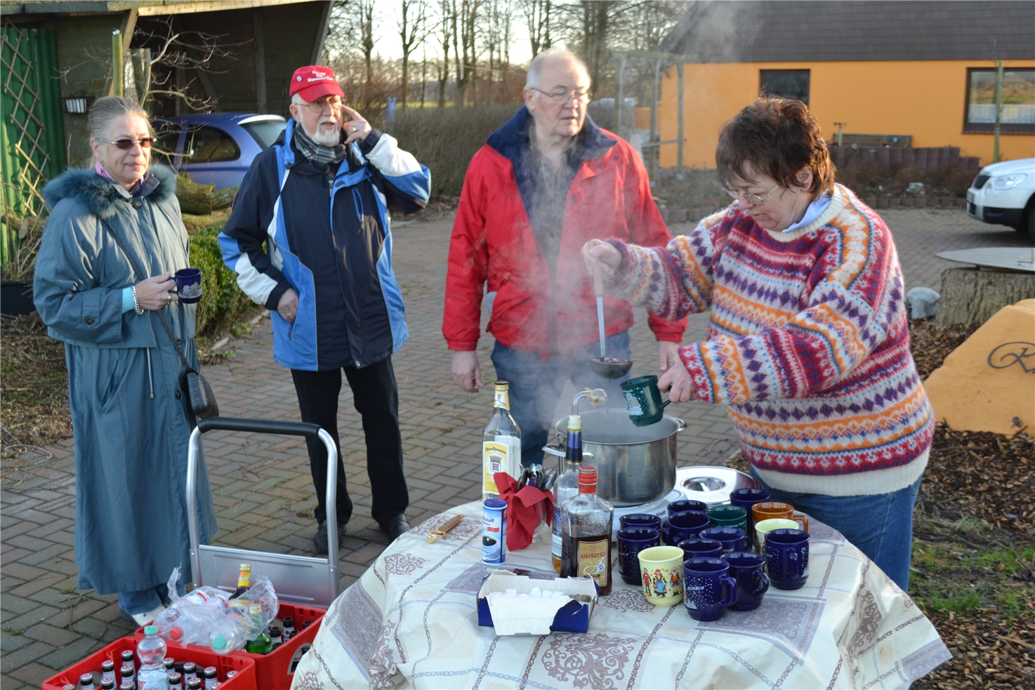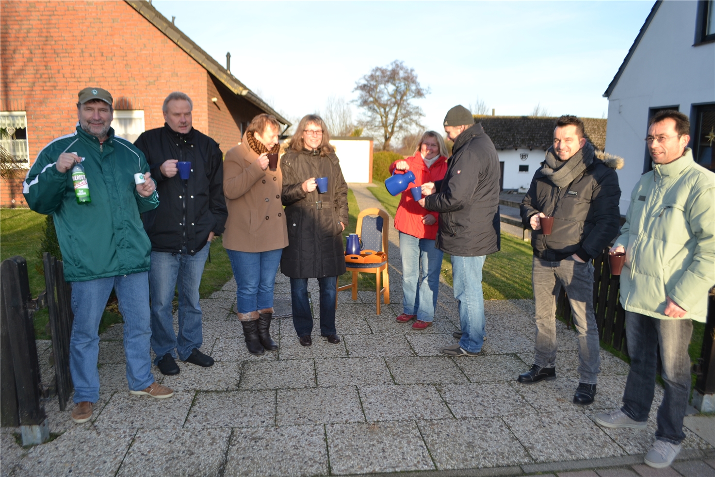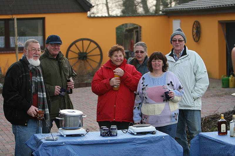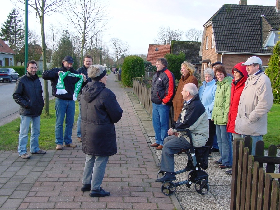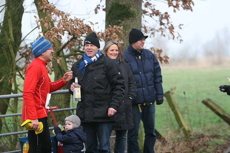 Die Helfer an der Strecke![]() Der Wetteinsatz Für die exakt 6,3 Kilometer lange Strecke war eine Flasche Korn. Die Zeiten haben sich geändert vor allem beim Laufen: 18 Minuten und 40 Sekunden beträgt die aktuelle Bestmarke, die Bryan Pollmann vom Geestemünder TV in den 80er Jahren markierte. Inzwischen laufen Jahr Für Jahr immer um die 100 Athleten mit. Diesmal waren es exakt 97 Teilnehmer. Willi Wolff ist als Zaungast noch immer mit beim traditionellen Lauf, der vom Dorumer Bahnhof bis in die Midlumer Ortsmitte führt. Geblieben sind auch die einstigen Mitstreiter und heutigen Organisatoren: Hans-Hermann Cramer, Jürgen Kirchwehm, Otto Frers und Manfred Hinners. Zehn Midlumer waren beim ersten Lauf vor gut 40 Jahren dabei, erinnert sich Kirchwehm und Willi war der Schnellste. Bei Debüt des Silvesterlaufs wären die Teilnehmer froh gewesen, wenn sie unterwegs auf eine Verpflegungsstation gestoßen wären. Durstig und kaputt sind wir ins Ziel gekommen, aber dann alles ganz schnell nachgeholt, verrät Hans-Hermann Cramer mit einem Augenzwinkern. Heute gibt es an der Strecke gleich drei Stationen, bei denen den Teilnehmern und Begleitern heiße oder kalte Getränke angeboten werden: In Südermarren, an der Königsbrücke und in der Milmer Ortsmitte. Hans-Peter und Heike Richter bauen ihren kleinen Stand am Radweg auf, bieten Punsch, Kaffee und kalte Getränke an. Nur wenige Läufer greifen zu, die meisten haben es sehr eilig, dafür machen die Begleiter bei uns gerne einen kurzen Stopp, berichtet Heike Richter. Gieß schnell Punsch ein, die ersten Durstigen kommen schon, sagt Freundin Dagmar Behrens. Als Letzte kämen die Kameraden von der Midlumer Feuerwehr, um sich einen Absacker zu holen. Danach bauen wir unseren Stand wieder ab, so Hans-Peter Richter. Einige 100 Meter weiter der nächste Stand: Auch an der Königsbrücke bieten Anwohner wärmende oder erfrischende Getränke an. In der Midlumer Ortsmitte wartet schließlich die Großfamilie Harsleben auf Läufer und Begleiter. Seit 15 Jahren bauen Bernd und Gabriela Harsleben mit Familienangehörigen hier einen Stand auf. Höhepunkt ist immer die frische Grillwurst, die sich alle schmecken lassen. Sport, 29