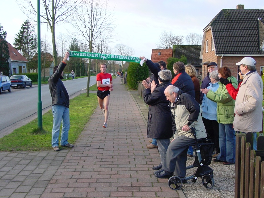 Veröffentlicht am: 02.01.08 Nordsee-Zeitung Bremerhaven Bestmarke bleibt weiter unerreichtJan-Ferdinand Lühmann und Birgit Grewe sind Neulinge auf der Siegerliste des Midlumer Silvesterlaufs / 99 TeilnehmerMidlum (jm). Ich wollte auf den letzten zwei Kilometern noch einmal richtig Gas geben, doch auf der unbekannten Strecke hatte ich nicht das richtige Feeling, mir fehlte das Zeitgefühl, sagte Jan-Ferdinand Lühmann. Der Athlet von Rot-Weiß Cuxhaven hatte soeben den 34. Midlumer Silvesterlauf gewonnen, war aber mit seiner Zeit nicht zufrieden. Für den 18-jährigen blieben die Stoppuhren bei seinem Debüt in Midlum bei 20:45 Minuten stehen. Eine Zeit, die rund zwei Minuten über der alten Bestmarke steht. Rekordhalter auf der 6,3 Kilometer langen Strecke zwischen dem Dorumer Bahnhof und der Midlumer Ortsmitte ist nach wie vor Bryan Pollmann (Geestemünder TV), der 1985 nach 18:40 Minuten über die Ziellinie lief. An die früher gelaufenen Zeiten kommen die Athleten kaum noch heran. Es ist lange her, dass der Sieger unter 20 Minuten geblieben ist, stellte Reinhard Roloff (TSG Nordholz), fest. Einen Grund konnte er nicht nennen. Die Bedingungen am Montag waren fast optimal. Der 61-jährige gehört zu den Stammgästen in Midlum und gewann einmal mehr die Klasse der älteren Läufer. 99 Läuferinnen und Läufer nahmen an der Startlinie Aufstellung. Walter Heyroth (TuS Wremen) war mit 73 Jahren ältester Teilnehmer. Der jüngste Läufer war mit acht Jahren Silas Gerstle aus Dorum. Gewertet wurde in diversen Altersklassen. Für die jeweiligen Klassensieger hielten der Veranstalter, der TSV Midlum, und der Schirmherr Werner Heins Pokale bereit. Aktive aus Karlsruhe, Bochum, Hamburg oder der Insel Helgoland gaben der Veranstaltung einen zusätzlichen Reiz. Als schnellste Frau wurde Birgit Grewe ausgezeichnet. Die 37-jährige Neuenwalderin benötigte 26:40 Minuten. Schnellster Midlumer war Sven Wersien (27:27), beste Midlumerin Stella Hansen (34:34). Bei den Seniorinnen triumphierte Claudia Barg (OSC Triathlon) in 27:33 Minuten. Bis zur Bahnüberquerung, etwa bis Kilometer zwei, konnte Birger Schmidt (Polizei Hamburg) noch mithalten. Danach zog Lühmann an und davon. Er vergrößerte kontinuierlich seinen Vorsprung. Der Rest des Feldes war chancenlos, erkannte der Hamburger die Leistung des späteren Siegers an. Im Ziel betrug Lühmanns Vorsprung gegenüber dem Zweitplatzierten Schmidt exakt 70 Sekunden. Männer, 18 bis 39 Jahre: 1.