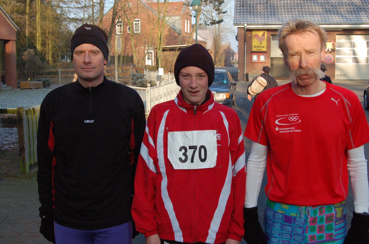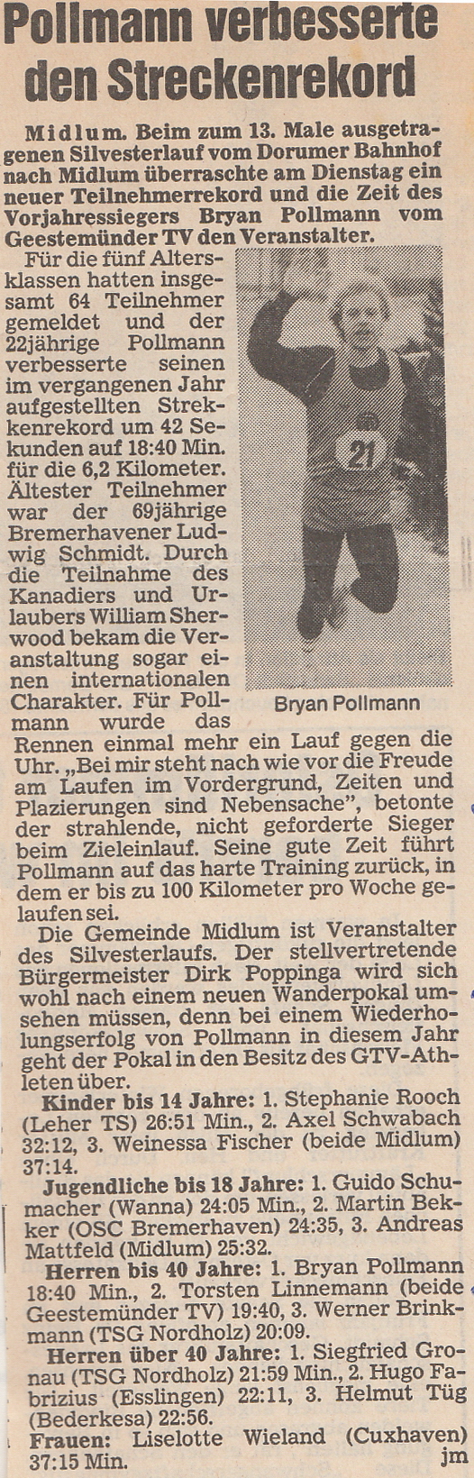 Veröffentlicht am: 02.01.01 Nordsee-Zeitung BremerhavenFrostiger SilvesterlaufNach den Erfolgen der vergangenen Jahre belegten sie auch diesmal die ersten drei Plätze: Bernd Loddeke, der die 6,3 Kilometer lange Wegstrecke von Dorum nach Midlum in der hervorragenden Zeit von 20:22 Minuten zurücklegte, gewann. Platz zwei belegte Christoph Weyer, er kam nach 20:29 Minuten ins Ziel. Dritter wurde mit 21 Minuten Maik Schwanemann. Mit 23:11 Minuten sicherte sich Franz Fischer (Seniorenklasse) den vierten Platz. Diesmal stellten sich etwa 80 Langstreckenläuferinnen und -läufer am Dorumer Bahnhof dem Starter. Für die Athleten war es auf Grund der teilweise überfrorenen Wegstrecke nicht immer einfach, die Balance zu halten. Um so erfreulicher war es für den Veranstalter, dass alle unbeschadet das Ziel in Midlum erreichten. Polizei und Midlumer Feuerwehr sorgten für eine sichere Streckenführung. Bester Midlumer wurde Christian Worm mit 25:35 Minuten. Die Ergebnisse