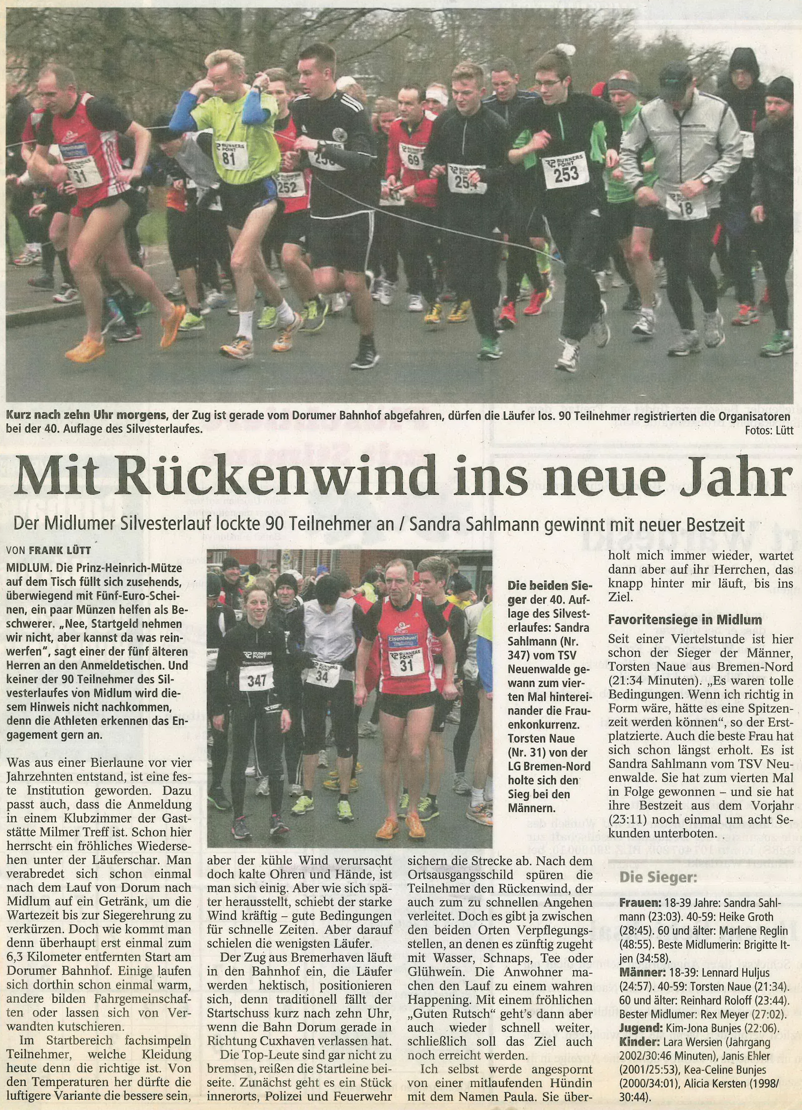 Veröffentlicht am: 03.01.13 Nordsee-Zeitung Bremerhaven Naue siegt bei Midlum-DebütBei Torsten Naue (LG Bremen-Nord) lieben die Uhren nach den 6,3 Kilometern bei 21:34 Minuten stehen. Eine Zeit, die zwar von Rückwind begünstigt wurde, aber die Bestmarke von Bryan Pollmann aus den 80er Jahren (18:40) weit überschritt. Bryan war ein Ausnahmeathlet, der die zehn Kilometer unter 30 Minuten laufen konnte, erläuterte Naue. Der Gewinner lobte die Strecke und die Organistoren: Eine ganz tolle Sache. Ich war heute zum ersten Mal dabei, aber nicht zum letzten Mal, versicherte der Bremer. Sehr zufrieden war auch Sandra Sahlmann (TSV Neuenwalde). Ich glaube, ich war heute noch schneller als im Vorjahr, sagte sie im Zielraum beim Blick auf ihre Uhr. Tatsächlich war sie mit 23:03 Minuten elf Sekunden schneller gewesen. Der Sieger aus dem Vorjahr, José Bexiga aus Mönchengladbach, kam diesmal nur als Drittschnellster (21:40) ins Ziel. Ich war diesmal nicht so gut vorbereitet, die beiden Erstplatzierten waren heute stärker, gestand er. Zwischen Naue und Bexiga hatte sich der Heerstedter Reiner Lenkert (21:38) geschoben. Von Absagen profitiert Mehr als 90 Läuferinnen und Läufer hatten sich am Silvestermorgen am Dorumer Bahnhof zum Lauf aufgestellt. Die Organisatoren profitierten bei der guten Teilnehmerzahl auch von den Ausfüllen und Absagen der Läufe in Nordenham und Bremen-Stuhr. Den Veranstalter, eine Gruppe Midlumer Bürger, war es wieder gelungen, den Allianz-Versicherungsvertreter Sebastian Hansen ins Boot zu holen, der nicht nur mitlief, sondern auch 14 Pokale stiftete. Außerdem erhielten alle Teilnehmer eine Erinnerungsmedaille an den 40. Midlumer Silvesterlauf. Als beste Midlumer wurden Rex Meyer (27:02 Minuten) und Brigitte Itjen (34:58) von den Organisatoren ausgezeichnet. Die Ergebnisse:Männer:18 bis 39 Jahre. 1. Lennard Huljus, 24:57; 2. Robert Emde, 27:55; 3. Timo Frischkorn (Cappel),