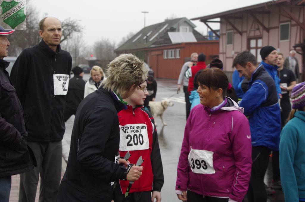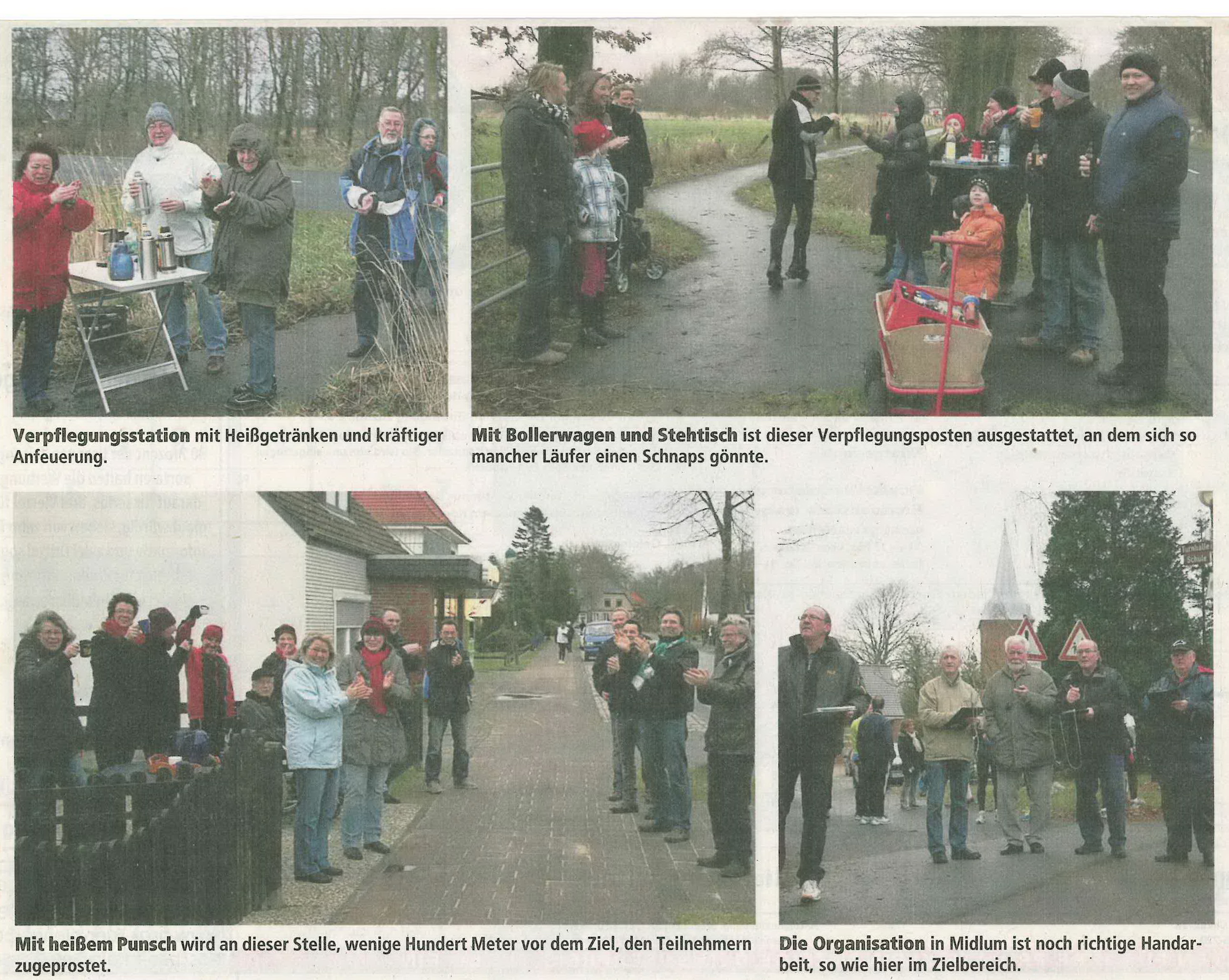 gegen Glatteis und Schneewehen behaupten. Die Strecke (6,3 Kilometer) führte vom Dorumer Bahnhof zur Midlumer Ortsmitte. "Aus Sicherheitsgründen gibt es keine Bedenken, aber lasst genügend Vorsicht walten", appellierte Polizeibeamter Hartmut Milter an die Aktiven. Gelaufen wurde bei der 32. Auflage auf dem Rad- und Fußweg. "Lauft nicht auf der Landesstraße, denn Autofahrer könnten die Lage falsch einschätzen und ins Schleudern kommen", sagte Milter. Auch die Zuschauer, überwiegend mitgebrachte Fans und Anlieger, ließen sich von Eis und Schnee nicht abhalten. An der Königsbrücke hatten Anwohner einen Getränkestand aufgebaut. "Nur wenige Athleten haben davon Gebrauch gemacht, aber vorbeifahrende Passanten hielten durchaus", war nach dem Lauf von Umstehenden zu erfahren. Etwa 600 Meter vor dem Ziel hatten es Anlieger eilig, Sand und Salz zu besorgen, um den vereisten Rad- und Fußweg zu streuen und so für ein sicheres Geläuf zu sorgen. Die Siegerehrung im "Deutschen Haus" in
