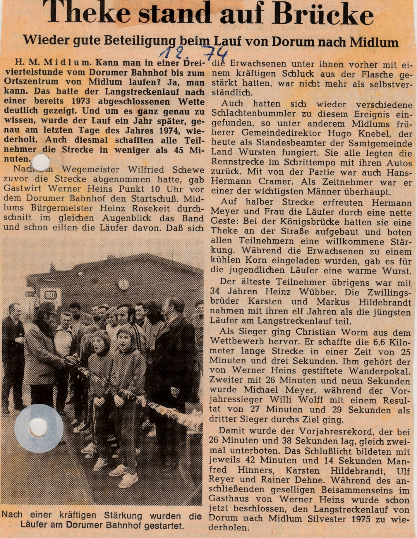 Heute erlebt der Midlumer Silvesterlauf seine 40. Auflage. Entstanden ist die Idee in einer Bierlaune am Stammtisch, erinnert sich der Midlumer Hans-Hermann Cramer. Damals ging es um eine Wette, ob man unter 45 Minuten vom Dorumer Bahnhof nach Midlum laufen könne. Die Wette nehmen wir an, sagte Willi Wolff zu Friedel Fiesenthaler, der eine Flasche Korn ausgesetzt hatte. Am 31. Dezember 1973 fiel der Startschuss Für die acht Teilnehmer. Sieger wurde Willi Wolff in 28.30 Minuten. Die Wette hatte er gewonnen, Fiesenthaler musste die Flasche Weizenkorn bezahlen. Nur Midlumer, die mitgelaufen waren, bekamen davon etwas ab. längst hat sich der Lauf zu einer sportlichen Veranstaltung entwickelt. Bei vielen Athleten hat der Midlumer Silvesterlauf einen festen Platz im Terminkalender. Um die 100 Teilnehmer stehen heute kurz vor 10 Uhr am Dorumer Bahnhof und fiebern dem Startschuss entgegen. Dann geht es auf Rekordjagd. Die Bestmarke hält noch Bryan Pollmann in 18:40 Minuten und ohne Korn. Ihr Jürgen Malekaitis |