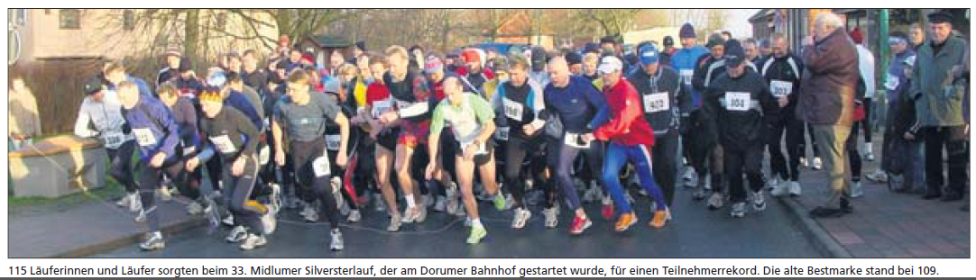 Midlumer SilvesterlaufDer Silvesterlauf, der 6,3 Kilometer vom Dorumer Bahnhof bis in die Midlumer Ortsmitte führt, erlebt am 31. Dezember seine 47.Auflage. Veranstalter ist die Gemeinde Midlum. Der Startschuss fällt um 10 Uhr.Die Weichen sind gestellt, wir sind gerüstet, berichtet das Organisationsteam. Die Idee, die einst am Stammtisch im Deutschen Haus in Midlum entstand und spontan umgesetzt wurde, ist heute als sportliches Event zum Jahresabschluss nicht mehr wegzudenken. In einer Bierlaune wurde gewettet, dass kein Midlumer die Strecke unter 45 Minuten schafft.