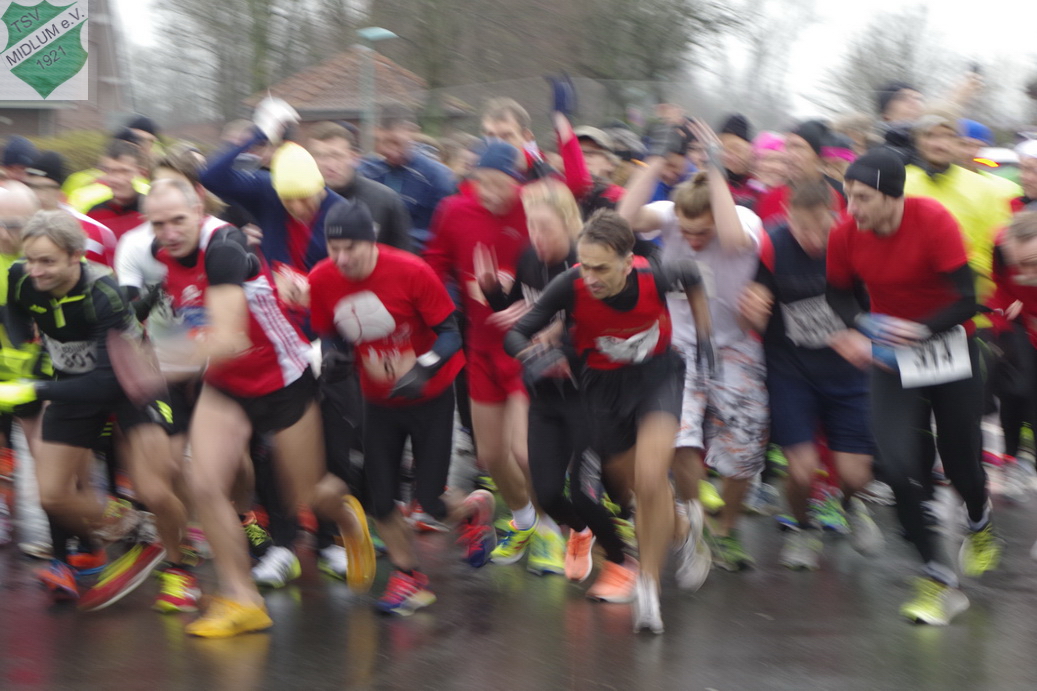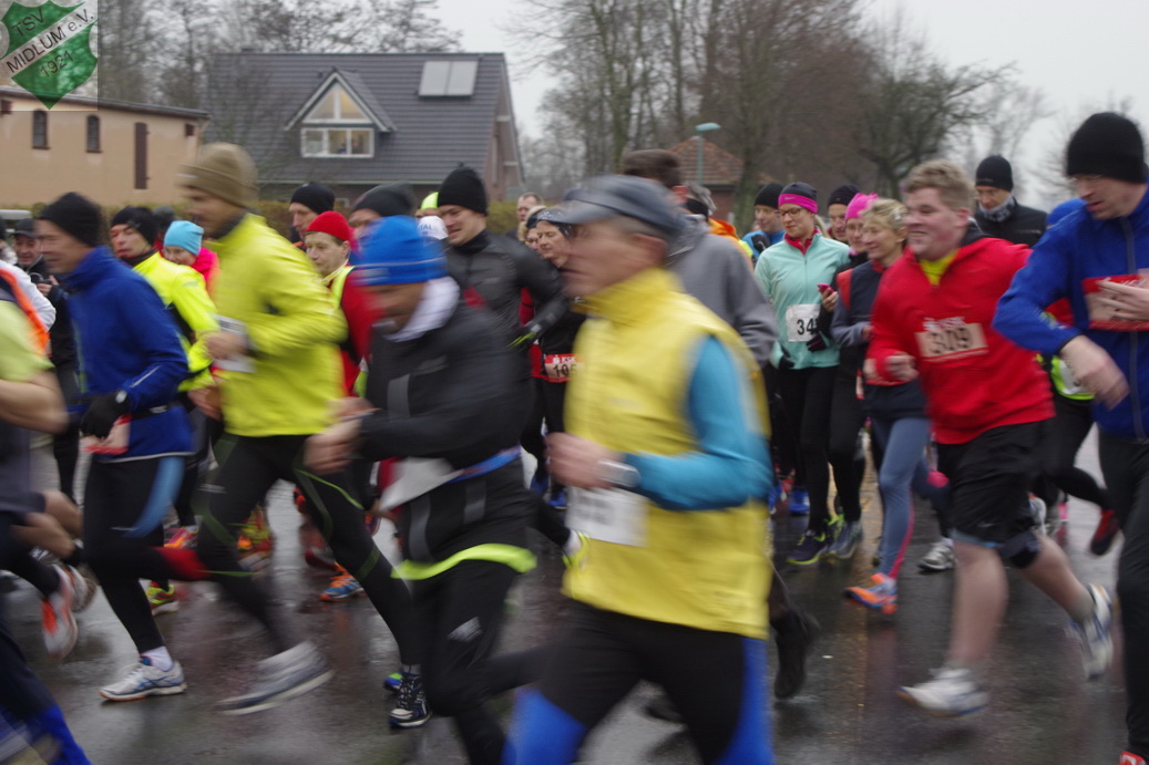 Den Startschuss gab der Bürgermeister der Gemeinde Wurster Nordseeküste Marcus Itjen. Die Freiwillige Feuerwehr Midlum begleitete das sportliche Ereignis am letzten Tag des Jahres. Ein eingespieltes Helferteam vom TSV Midlum kümmerte sich um Zeitnahme und Listenführung. „Wir danken dem TSV Wanna, der uns die professionelle Zeitnahme-Technik zur Verfügung gestellt hat“, betonte Zeitnehmer Hans-Jürgen Bopp. Hans-Hermann Cramer, der jahrzehntelang den Midlumer Silvesterlauf als Chef-Organisator geprägt hatte, sei in diesem Jahr leider verstorben, so Bopp. Veranstalter des Laufes ist die Gemeinde Midlum. Die Idee zum Silvesterlauf in Midlum war vor 48 Jahren am Stammtisch im Deutschen Haus in Midlum entstanden und ist heute als sportliches Event zum Jahresabschluss für viele Läufer der Region nicht mehr wegzudenken. Damals wurde aus einer Bierlaune heraus gewettet, dass kein Midlumer die Strecke unter 35 Minuten schafft. Willi Wolf aus Midlum war 1973 der erste Sieger und unterbot diese Zeit deutlich, weiß Bopp. Kurios ist auch die Startzeit des Laufes am Silvestermorgen um 10 Uhr. „Wir müssen immer erst warten, bis der Personenzug aus Cuxhaven den Bahnhof in Dorum verlassen hat“, erzählt Bopp. Bei Verspätung würde sich auch der Start entsprechend verzögern. „Sonst stehen die ersten Läufer nach kurzer Zeit vor der geschlossenen Bahnschranke“ weist der Organisator auf die Besonderheiten des Silvesterlaufs hin.
